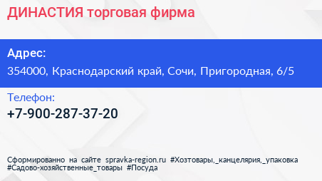ДИНАСТИЯ, торговая фирма по адресу 354000, Краснодарский край, Сочи, Пригородная, 6/5 в дальнейшем Организация, размещена в следующих категориях:
