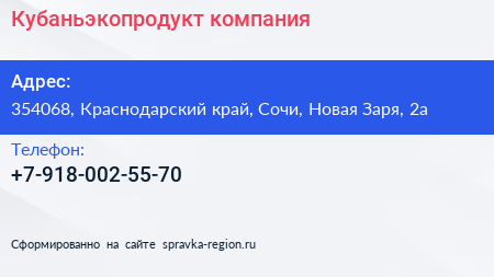 Кубаньэкопродукт, компания по адресу 354068, Краснодарский край, Сочи, Новая Заря, 2а в дальнейшем Организация, размещена в следующих категориях: