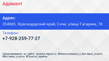 Адамант по адресу 354065, Краснодарский край, Сочи, улица Гагарина, 76 в дальнейшем Организация, размещена в следующих категориях: