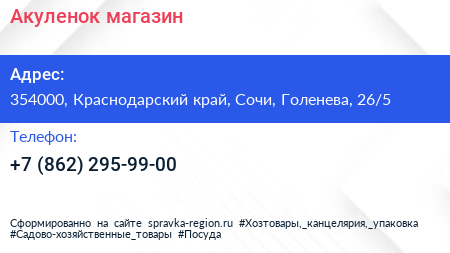 Акуленок, магазин по адресу 354000, Краснодарский край, Сочи, Голенева, 26/5 в дальнейшем Организация, размещена в следующих категориях: