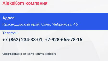 AleksKom, компания по адресу Краснодарский край, Сочи, Чебрикова, 46 в дальнейшем Организация, размещена в следующих категориях: