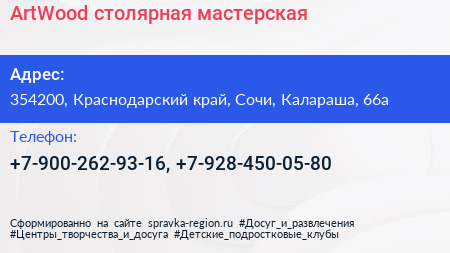 ArtWood, столярная мастерская по адресу 354200, Краснодарский край, Сочи, Калараша, 66а в дальнейшем Организация, размещена в следующих категориях: