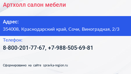 Артхолл, салон мебели по адресу 354008, Краснодарский край, Сочи, Виноградная, 2/3 в дальнейшем Организация, размещена в следующих категориях: