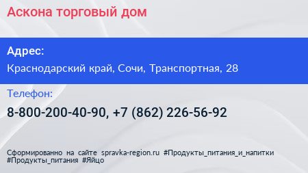 Аскона, торговый дом по адресу Краснодарский край, Сочи, Транспортная, 28 в дальнейшем Организация, размещена в следующих категориях: