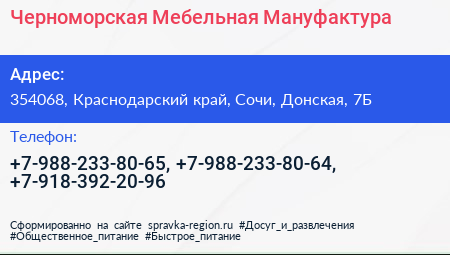 Черноморская Мебельная Мануфактура по адресу 354068, Краснодарский край, Сочи, Донская, 7Б в дальнейшем Организация, размещена в следующих категориях: