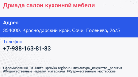 Дриада, салон кухонной мебели по адресу 354000, Краснодарский край, Сочи, Голенева, 26/5 в дальнейшем Организация, размещена в следующих категориях: