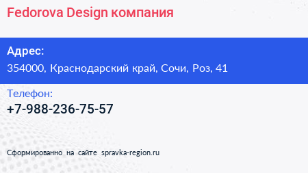 Fedorova Design, компания по адресу 354000, Краснодарский край, Сочи, Роз, 41 в дальнейшем Организация, размещена в следующих категориях: