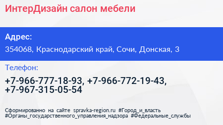 ИнтерДизайн, салон мебели по адресу 354068, Краснодарский край, Сочи, Донская, 3 в дальнейшем Организация, размещена в следующих категориях: