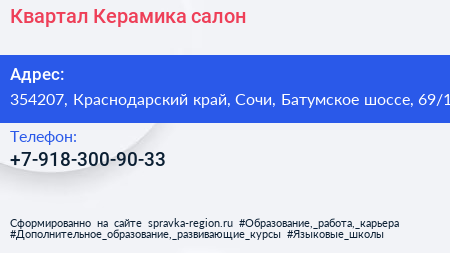 Квартал-Керамика, салон по адресу 354207, Краснодарский край, Сочи, Батумское шоссе, 69/1 в дальнейшем Организация, размещена в следующих категориях: