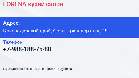 LORENA кухни, салон по адресу Краснодарский край, Сочи, Транспортная, 28 в дальнейшем Организация, размещена в следующих категориях:
