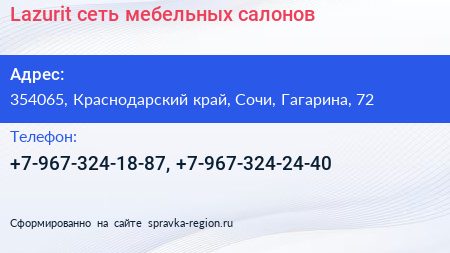 Lazurit, сеть мебельных салонов по адресу 354065, Краснодарский край, Сочи, Гагарина, 72 в дальнейшем Организация, размещена в следующих категориях: