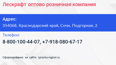 Лескрафт, оптово-розничная компания по адресу 354068, Краснодарский край, Сочи, Подгорная, 2 в дальнейшем Организация, размещена в следующих категориях: