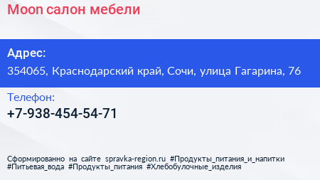Moon, салон мебели по адресу 354065, Краснодарский край, Сочи, улица Гагарина, 76 в дальнейшем Организация, размещена в следующих категориях: