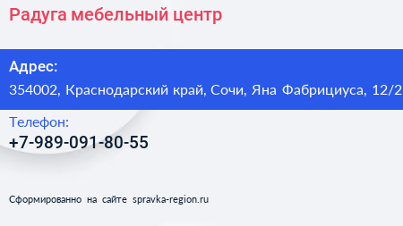 Радуга, мебельный центр по адресу 354002, Краснодарский край, Сочи, Яна Фабрициуса, 12/2 в дальнейшем Организация, размещена в следующих категориях: