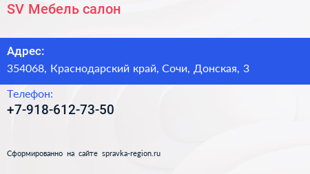 SV-Мебель, салон по адресу 354068, Краснодарский край, Сочи, Донская, 3 в дальнейшем Организация, размещена в следующих категориях: