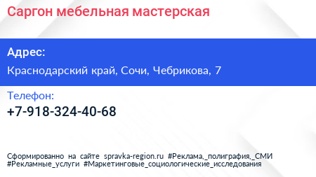 Саргон, мебельная мастерская по адресу Краснодарский край, Сочи, Чебрикова, 7 в дальнейшем Организация, размещена в следующих категориях: