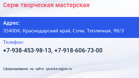 Серж, творческая мастерская по адресу 354004, Краснодарский край, Сочи, Тепличная, 98/3 в дальнейшем Организация, размещена в следующих категориях: