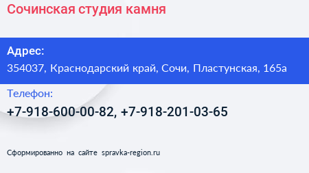Сочинская студия камня по адресу 354037, Краснодарский край, Сочи, Пластунская, 165а в дальнейшем Организация, размещена в следующих категориях: