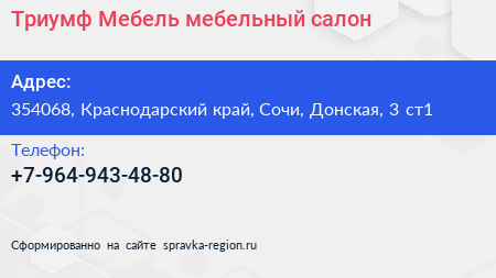 Триумф Мебель, мебельный салон по адресу 354068, Краснодарский край, Сочи, Донская, 3 ст1 в дальнейшем Организация, размещена в следующих категориях: