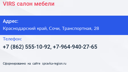 VIRS, салон мебели по адресу Краснодарский край, Сочи, Транспортная, 28 в дальнейшем Организация, размещена в следующих категориях: