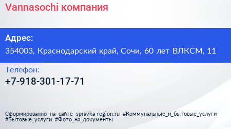 Vannasochi, компания по адресу 354003, Краснодарский край, Сочи, 60 лет ВЛКСМ, 11 в дальнейшем Организация, размещена в следующих категориях: