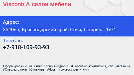 Visconti-A, салон мебели по адресу 354065, Краснодарский край, Сочи, Гагарина, 16/1 в дальнейшем Организация, размещена в следующих категориях:
