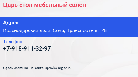 Царь-стол, мебельный салон по адресу Краснодарский край, Сочи, Транспортная, 28 в дальнейшем Организация, размещена в следующих категориях: