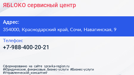 ЯБLOKO, сервисный центр по адресу 354000, Краснодарский край, Сочи, Навагинская, 9 в дальнейшем Организация, размещена в следующих категориях: