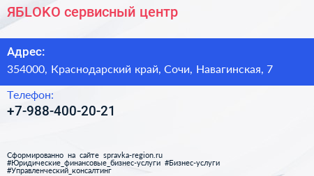ЯБLOKO, сервисный центр по адресу 354000, Краснодарский край, Сочи, Навагинская, 7 в дальнейшем Организация, размещена в следующих категориях: