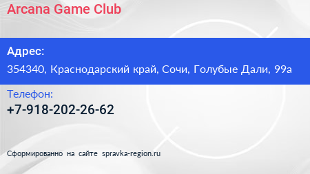 Arcana Game Club по адресу 354340, Краснодарский край, Сочи, Голубые Дали, 99а в дальнейшем Организация, размещена в следующих категориях: