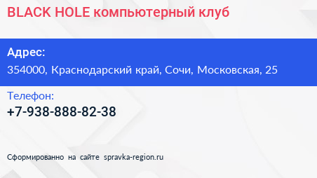 BLACK HOLE, компьютерный клуб по адресу 354000, Краснодарский край, Сочи, Московская, 25 в дальнейшем Организация, размещена в следующих категориях: