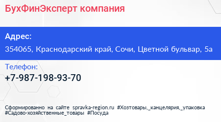 БухФинЭксперт, компания по адресу 354065, Краснодарский край, Сочи, Цветной бульвар, 5а в дальнейшем Организация, размещена в следующих категориях: