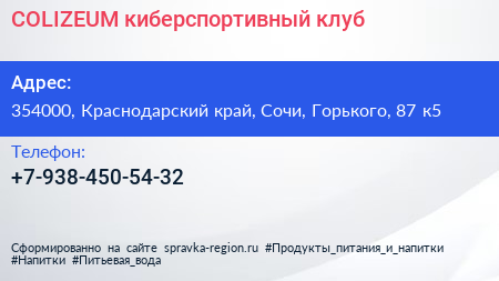 COLIZEUM, киберспортивный клуб по адресу 354000, Краснодарский край, Сочи, Горького, 87 к5 в дальнейшем Организация, размещена в следующих категориях:
