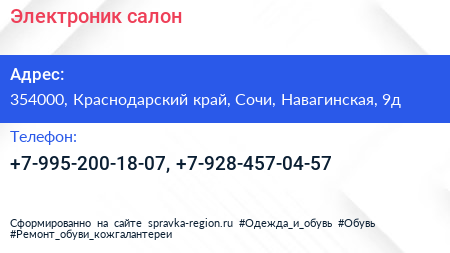 Электроник, салон по адресу 354000, Краснодарский край, Сочи, Навагинская, 9д в дальнейшем Организация, размещена в следующих категориях: