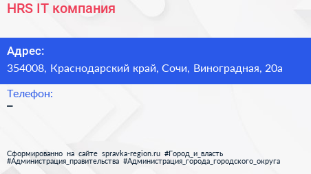 HRS, IT-компания по адресу 354008, Краснодарский край, Сочи, Виноградная, 20а в дальнейшем Организация, размещена в следующих категориях: