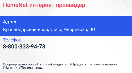 HomeNet, интернет-провайдер по адресу Краснодарский край, Сочи, Чебрикова, 40 в дальнейшем Организация, размещена в следующих категориях: