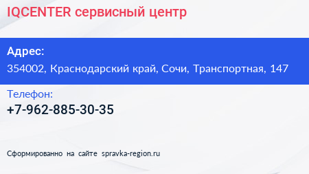 IQCENTER, сервисный центр по адресу 354002, Краснодарский край, Сочи, Транспортная, 147 в дальнейшем Организация, размещена в следующих категориях: