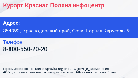Курорт Красная Поляна, инфоцентр по адресу 354392, Краснодарский край, Сочи, Горная Карусель, 9 в дальнейшем Организация, размещена в следующих категориях: