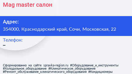 Mag master, салон по адресу 354000, Краснодарский край, Сочи, Московская, 22 в дальнейшем Организация, размещена в следующих категориях: