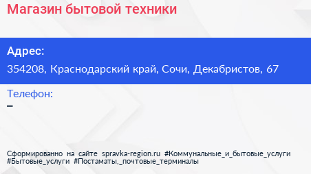 Магазин бытовой техники по адресу 354208, Краснодарский край, Сочи, Декабристов, 67 в дальнейшем Организация, размещена в следующих категориях: