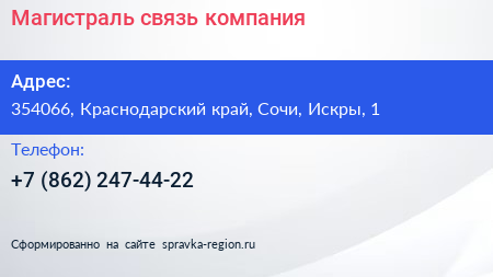 Магистраль связь, компания по адресу 354066, Краснодарский край, Сочи, Искры, 1 в дальнейшем Организация, размещена в следующих категориях: