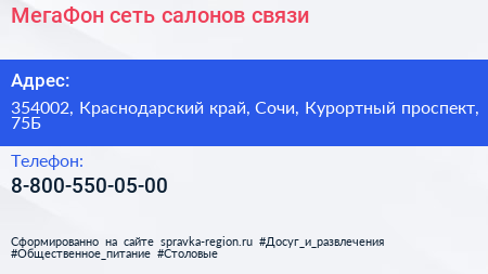 МегаФон, сеть салонов связи по адресу 354002, Краснодарский край, Сочи, Курортный проспект, 75Б в дальнейшем Организация, размещена в следующих категориях: