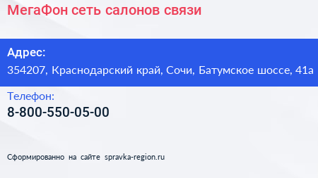 МегаФон, сеть салонов связи по адресу 354207, Краснодарский край, Сочи, Батумское шоссе, 41а в дальнейшем Организация, размещена в следующих категориях: