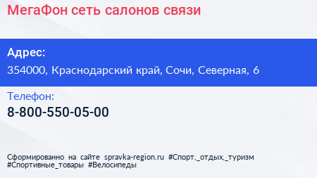 МегаФон, сеть салонов связи по адресу 354000, Краснодарский край, Сочи, Северная, 6 в дальнейшем Организация, размещена в следующих категориях: