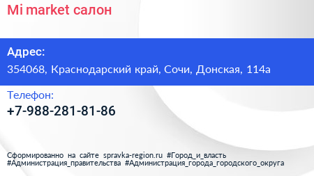 Mi market, салон по адресу 354068, Краснодарский край, Сочи, Донская, 114а в дальнейшем Организация, размещена в следующих категориях:
