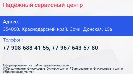 Надёжный, сервисный центр по адресу 354068, Краснодарский край, Сочи, Донская, 15а в дальнейшем Организация, размещена в следующих категориях: