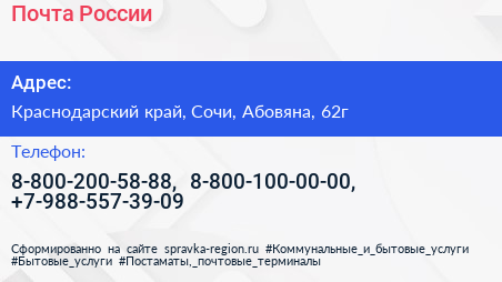 Почта России по адресу Краснодарский край, Сочи, Абовяна, 62г в дальнейшем Организация, размещена в следующих категориях: