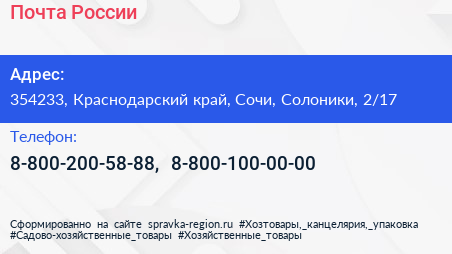 Почта России по адресу 354233, Краснодарский край, Сочи, Солоники, 2/17 в дальнейшем Организация, размещена в следующих категориях: