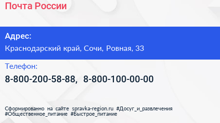 Почта России по адресу Краснодарский край, Сочи, Ровная, 33 в дальнейшем Организация, размещена в следующих категориях: