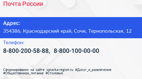 Почта России по адресу 354386, Краснодарский край, Сочи, Тернопольская, 12 в дальнейшем Организация, размещена в следующих категориях: